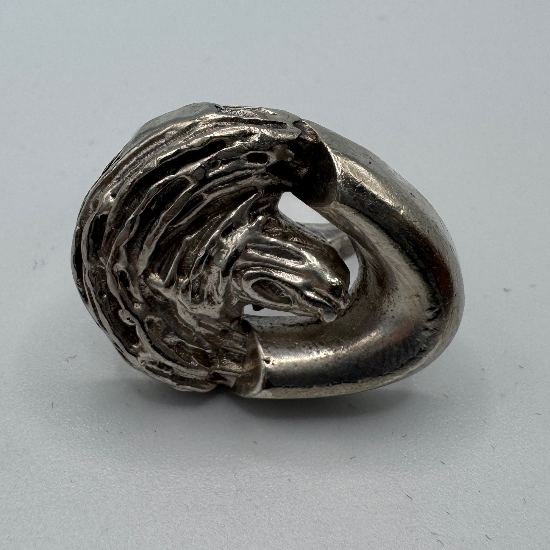 Une création pleine de mouvement et de caractère. Cette bague en argent massif présente une forme sculpturale aux lignes fluides, presque liquides, évoquant une vague ou une étoffe enroulée.