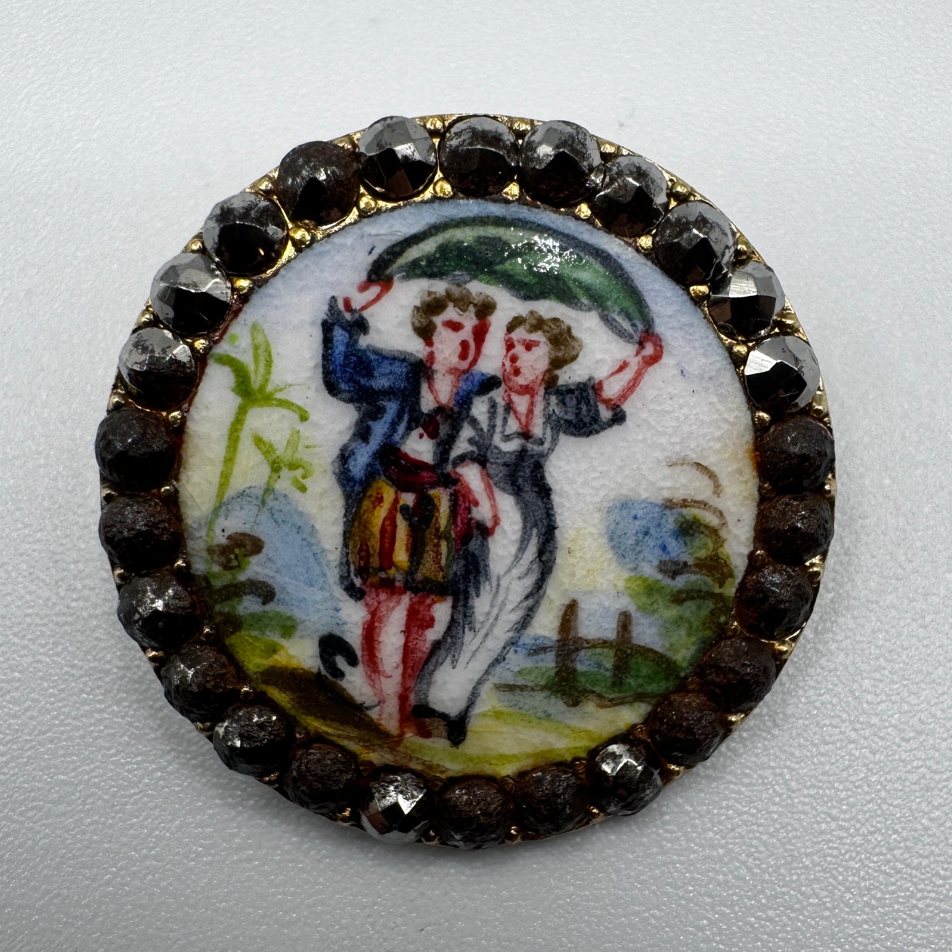 Bouton ancien XIXe « scène galante » - bronze emaillé