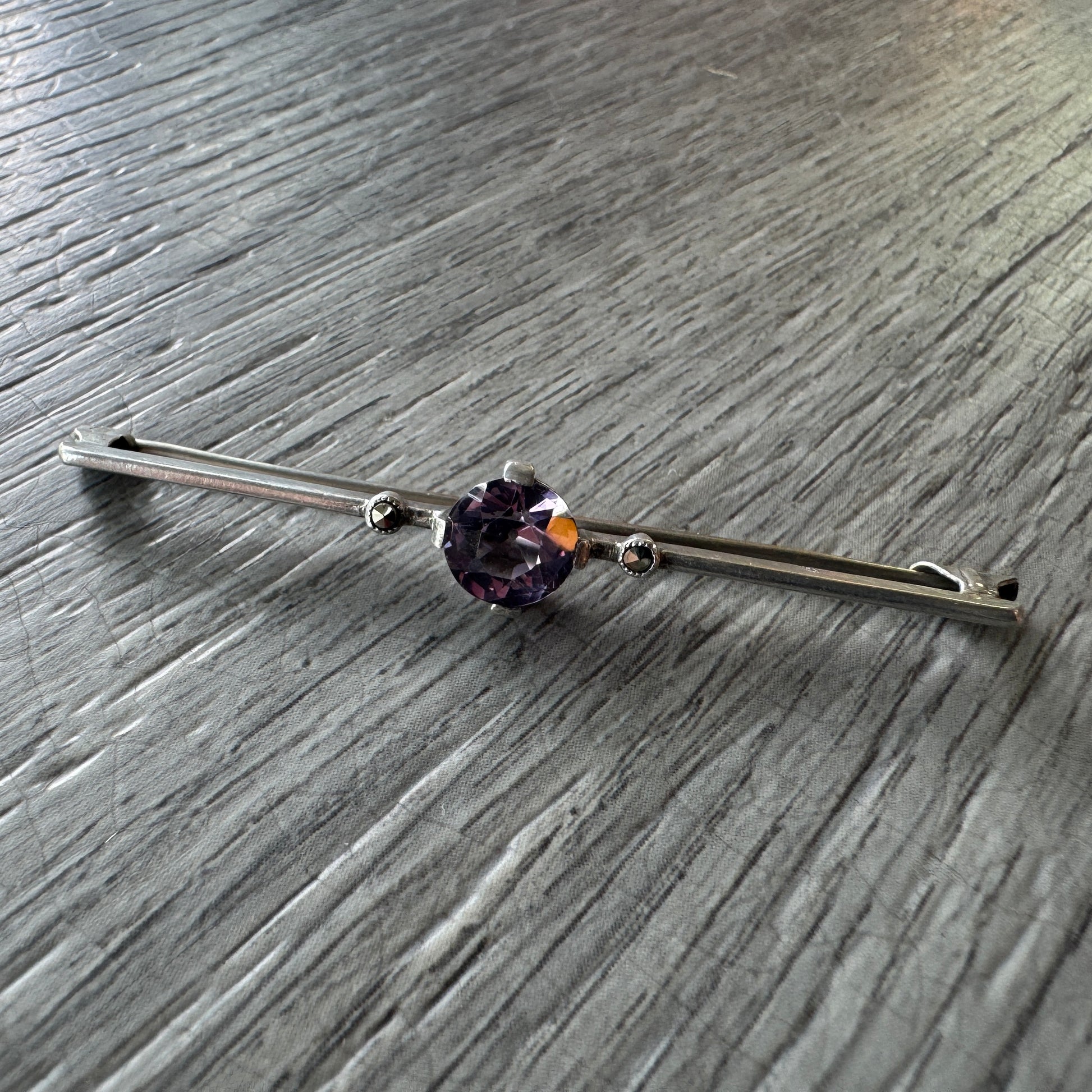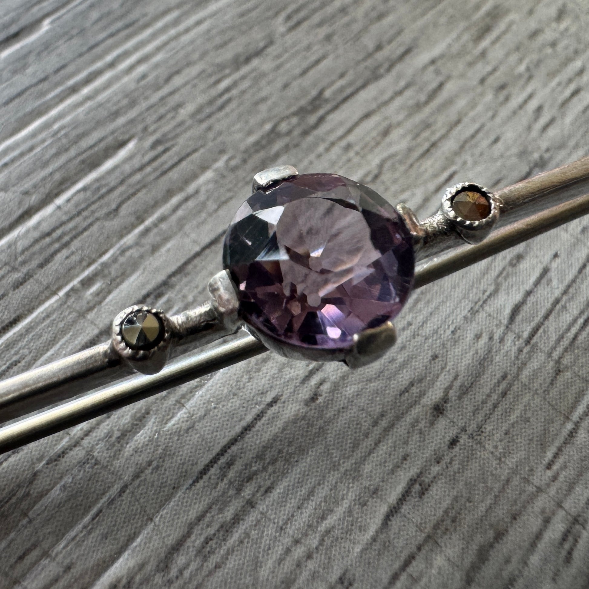 Raffinée et élégante, cette broche ancienne en argent massif poinçon sanglier se distingue par son design sobre et rectiligne typique du mouvement Art Déco. Mettant en valeur une superbe améthyste facettée de couleur violet clair. La pierre, taillée en rond, est rehaussée de deux petites perles métalliques serties de part et d'autre, soulignant son éclat.
