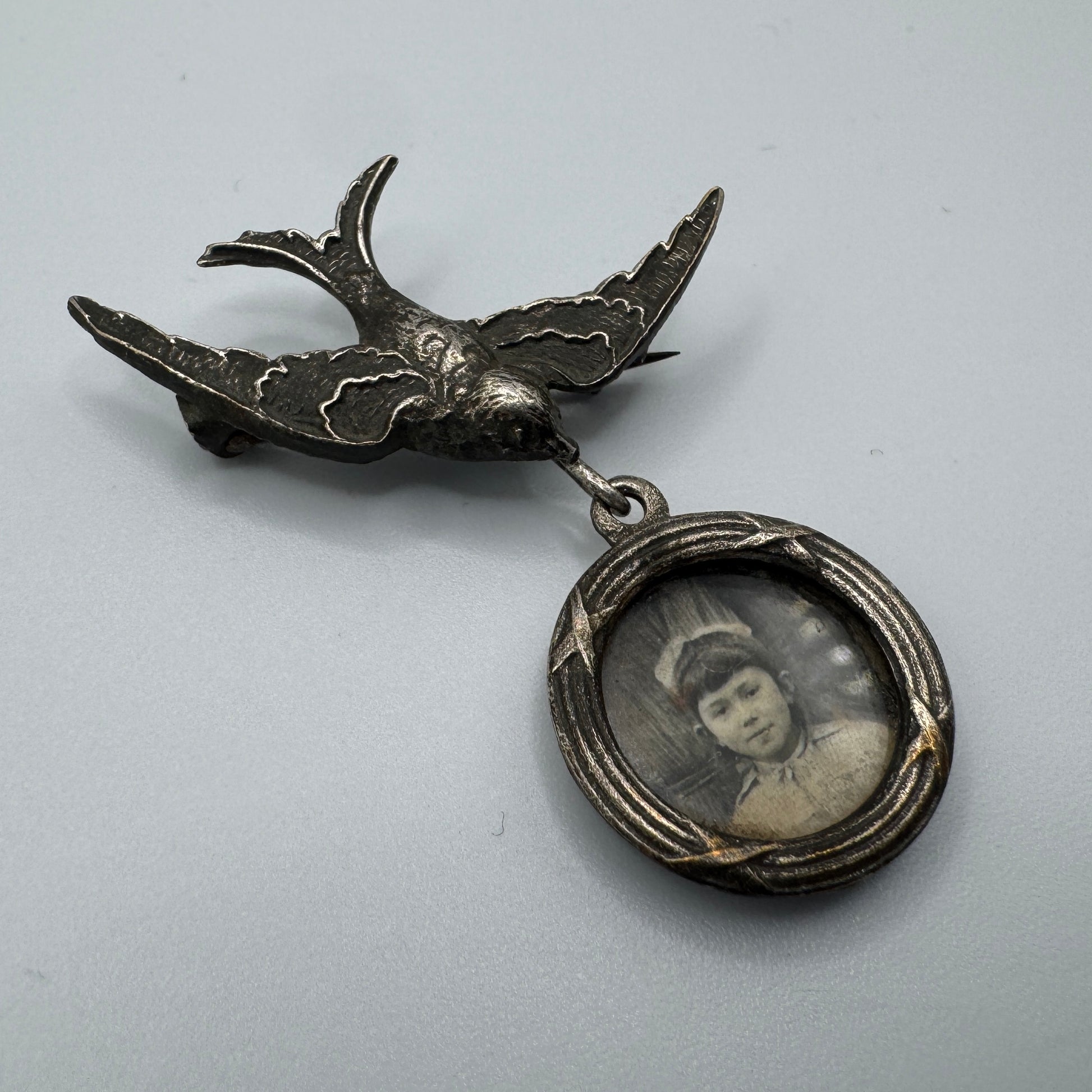 Charmante broche ancienne en forme d'hirondelle en plein vol, tenant un petit médaillon photo suspendu.