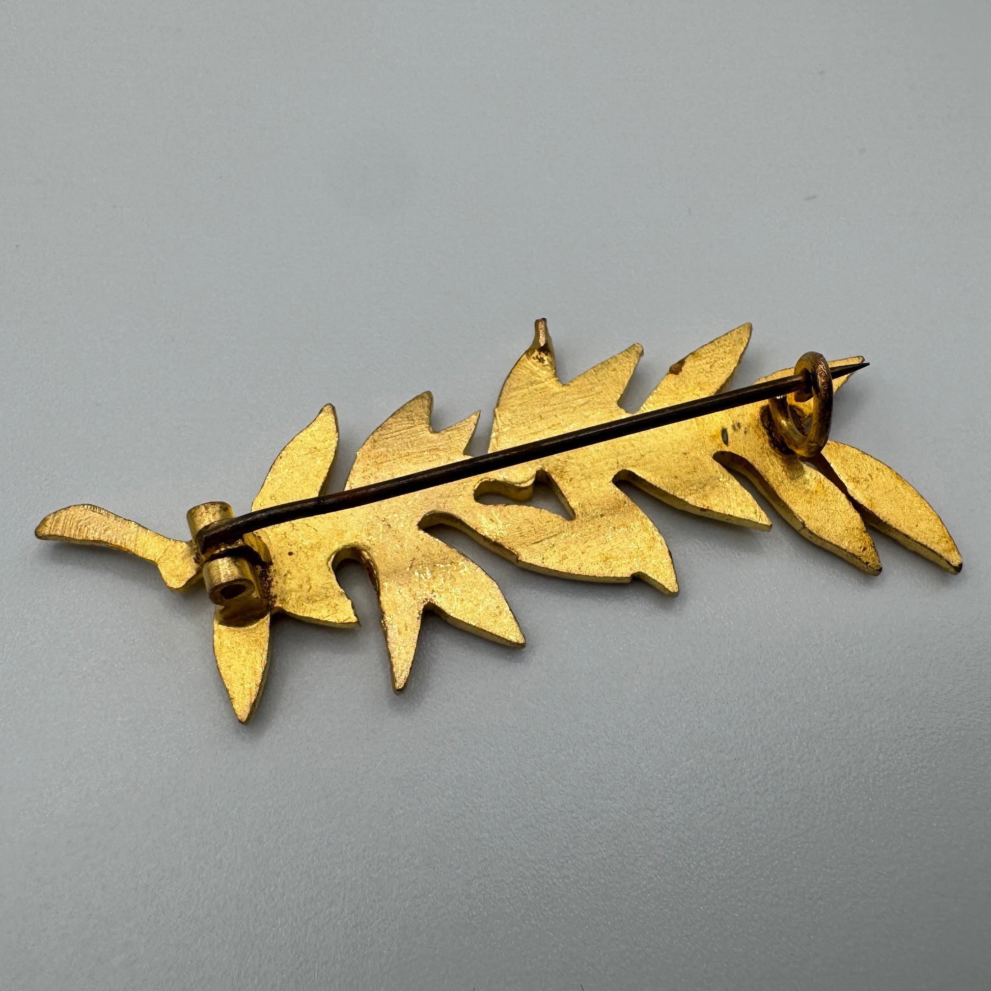 Elégante broche ancienne en forme de rameau d'olivier, finement travaillé dans une monture en métal doré. Les feuilles ciselées en relief apportent du réalisme et reflètent la lumière avec raffinement.