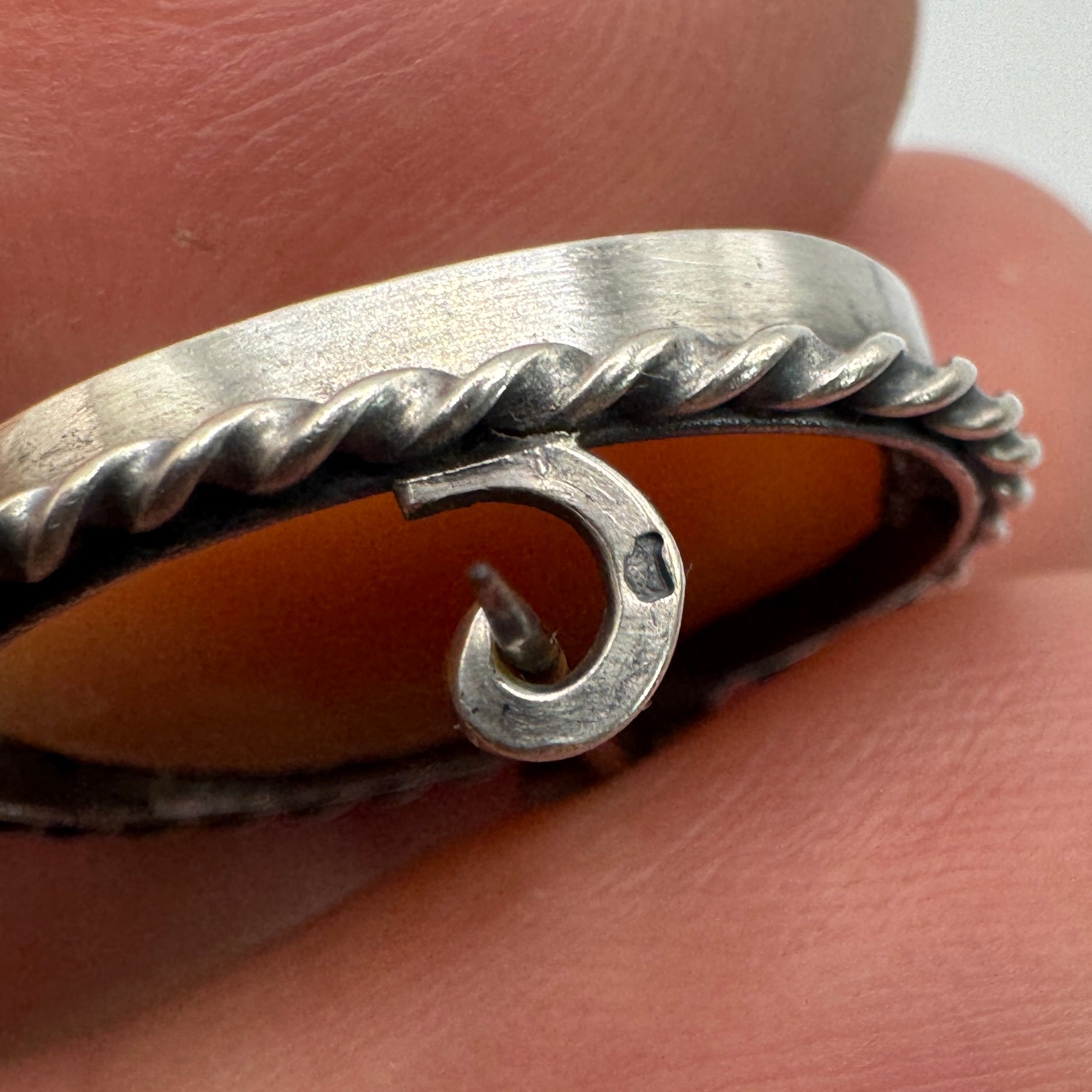 Le camée est serti dans une monture en argent ciselé à décor torsadé, équipée d'une attache ancienne à crochet.