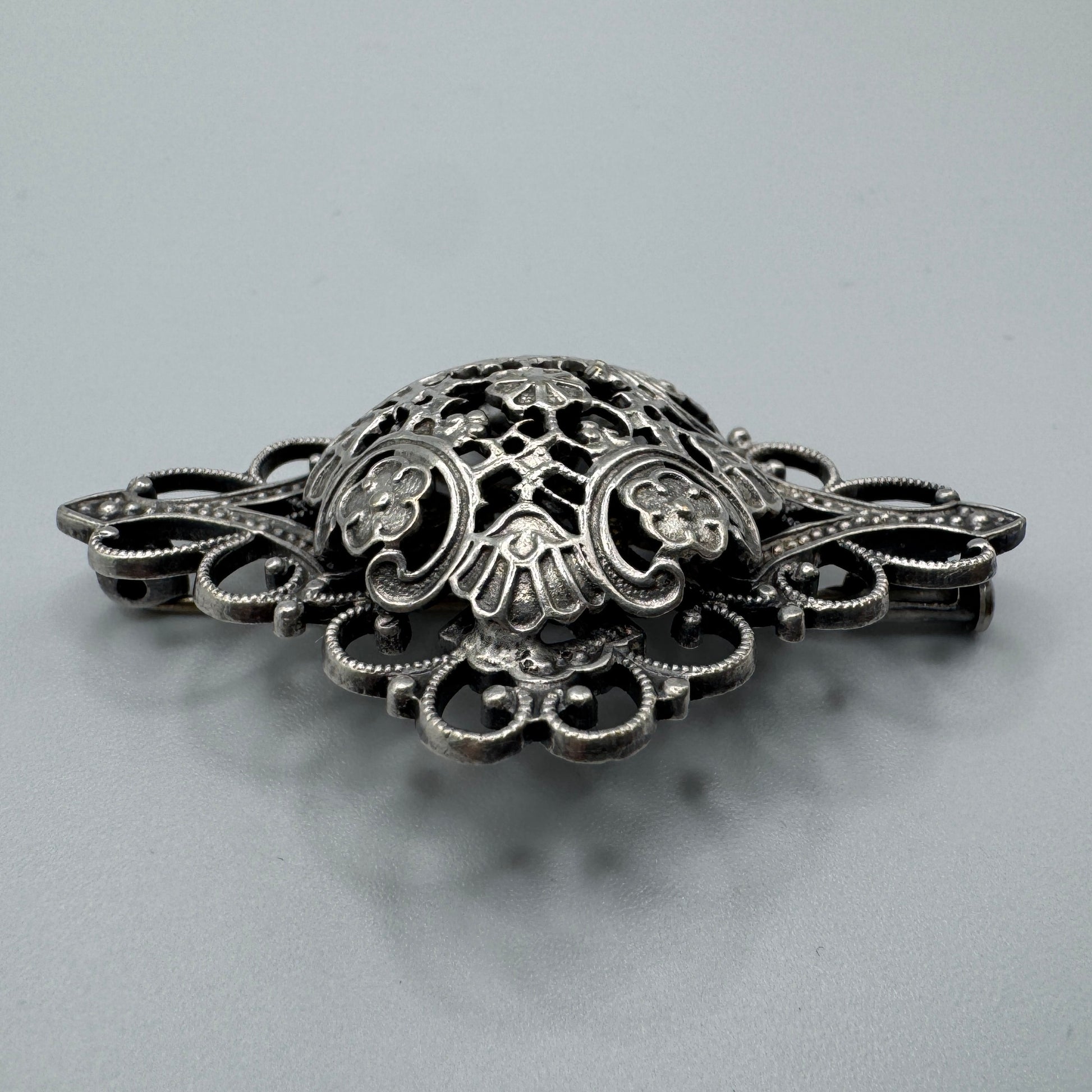 Elégante broche ancienne en métal argenté, travaillée dans un motif ajouré et symétrique orné de fleurs stylisées. Son design raffiné mêle arabesques, volutes et petits détails perlés, lui donnant un éclat délicat et une allure intemporelle.