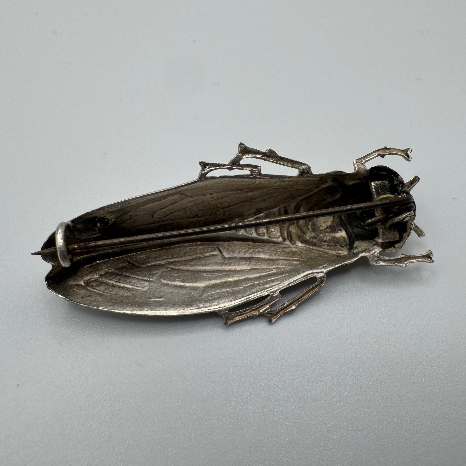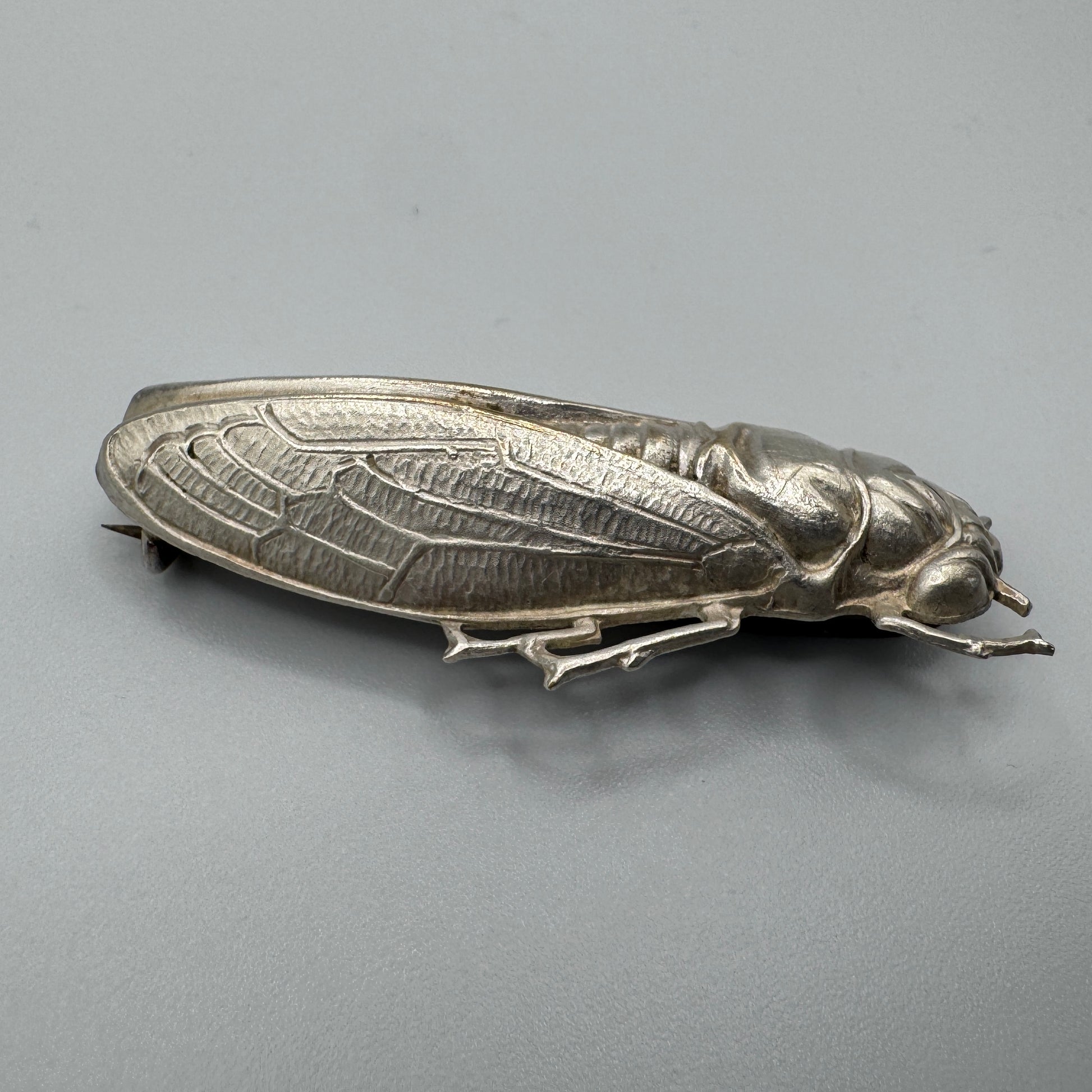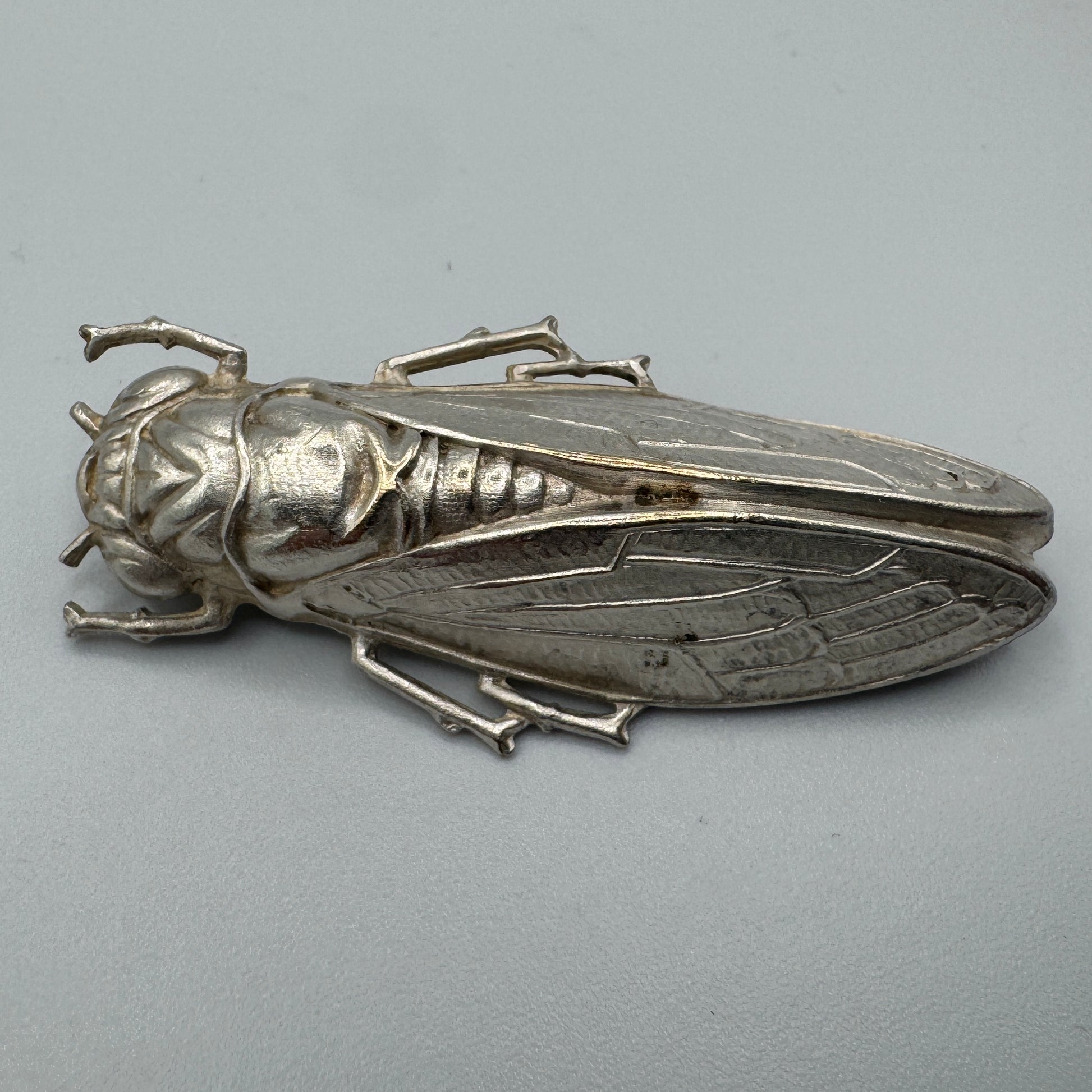 Charmante broche ancienne représentant une cigale, finement travaillée en métal argenté. Avec ses ailes nervurées et son corps détaillé, ce bijou incarne le symbole de la Provence, de l'été et du chant ensoleillé.