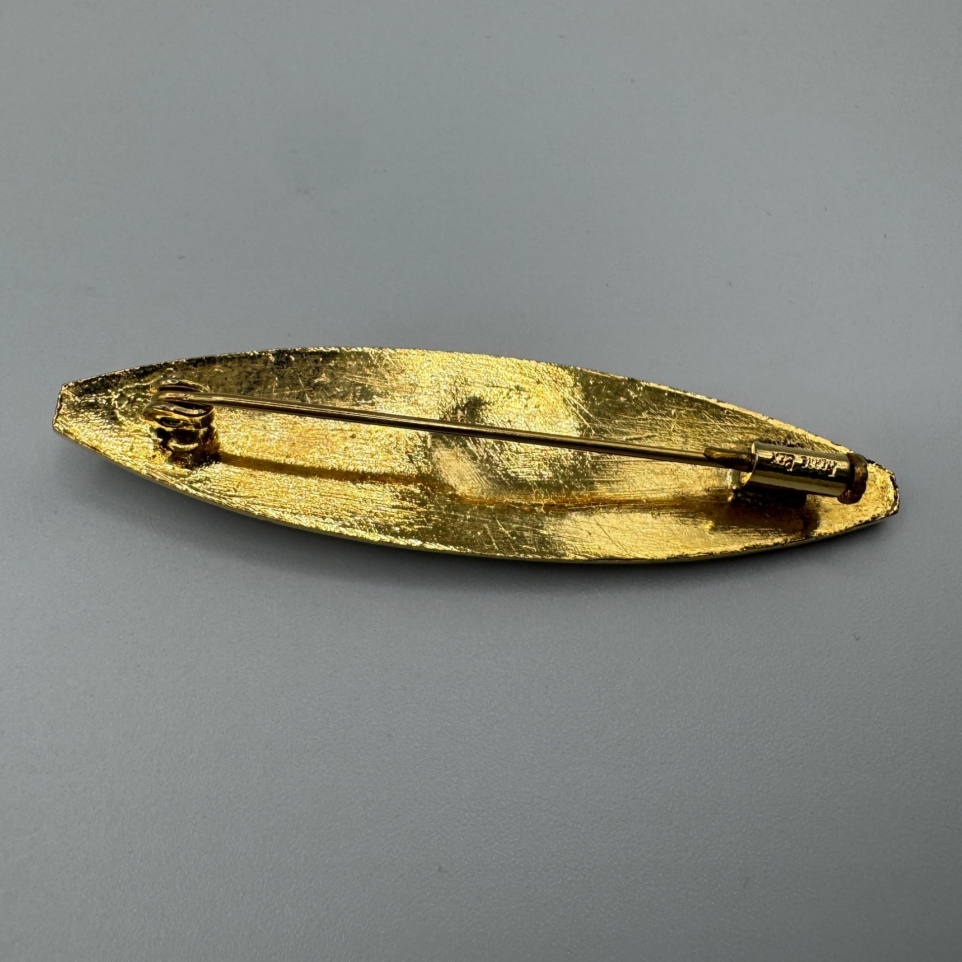 Magnifique broche ancienne signée Pierre Bex, en métal doré décoré d'émaux colorés vert et noir et de strass étincelants disposés dans un élégant motif géométrique typiquement Art Déco. Cette pièce allie la richesse des couleurs à l'éclat du cristal pour un rendu raffiné et intemporel.