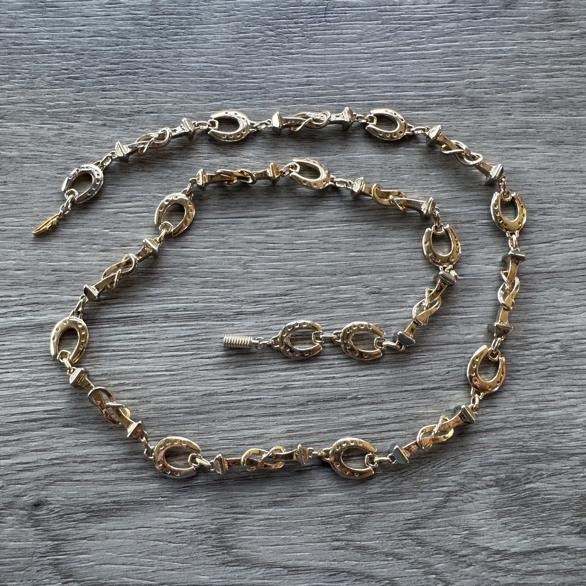 Ce superbe collier vintage se distingue par son design original inspiré de l'univers équestre. Alternant fers à cheval porte-bonheur et mors entrelacés, chaque maillon est finement travaillé en métal doré pour un rendu à la fois élégant et audacieux.