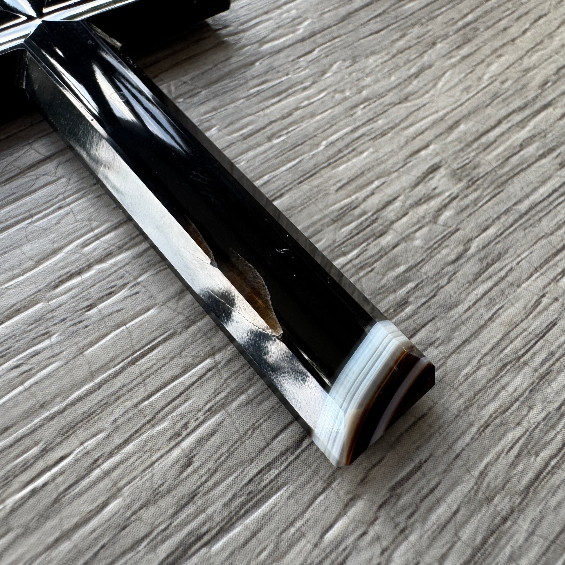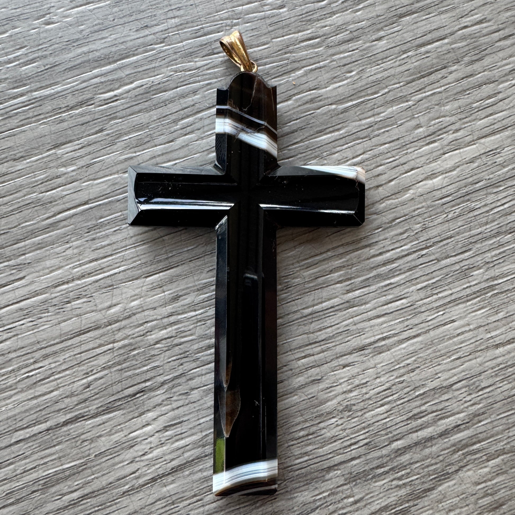Elégante croix pendentif taillée dans une agate naturelle, aux nuances noires profondes rehaussées de bandes blanches et brunes. Chaque pièce est unique grâce aux veines minérales de la pierre. la bélière en métal doré permet de la porter facilement sur une chaîne ou un cordon.