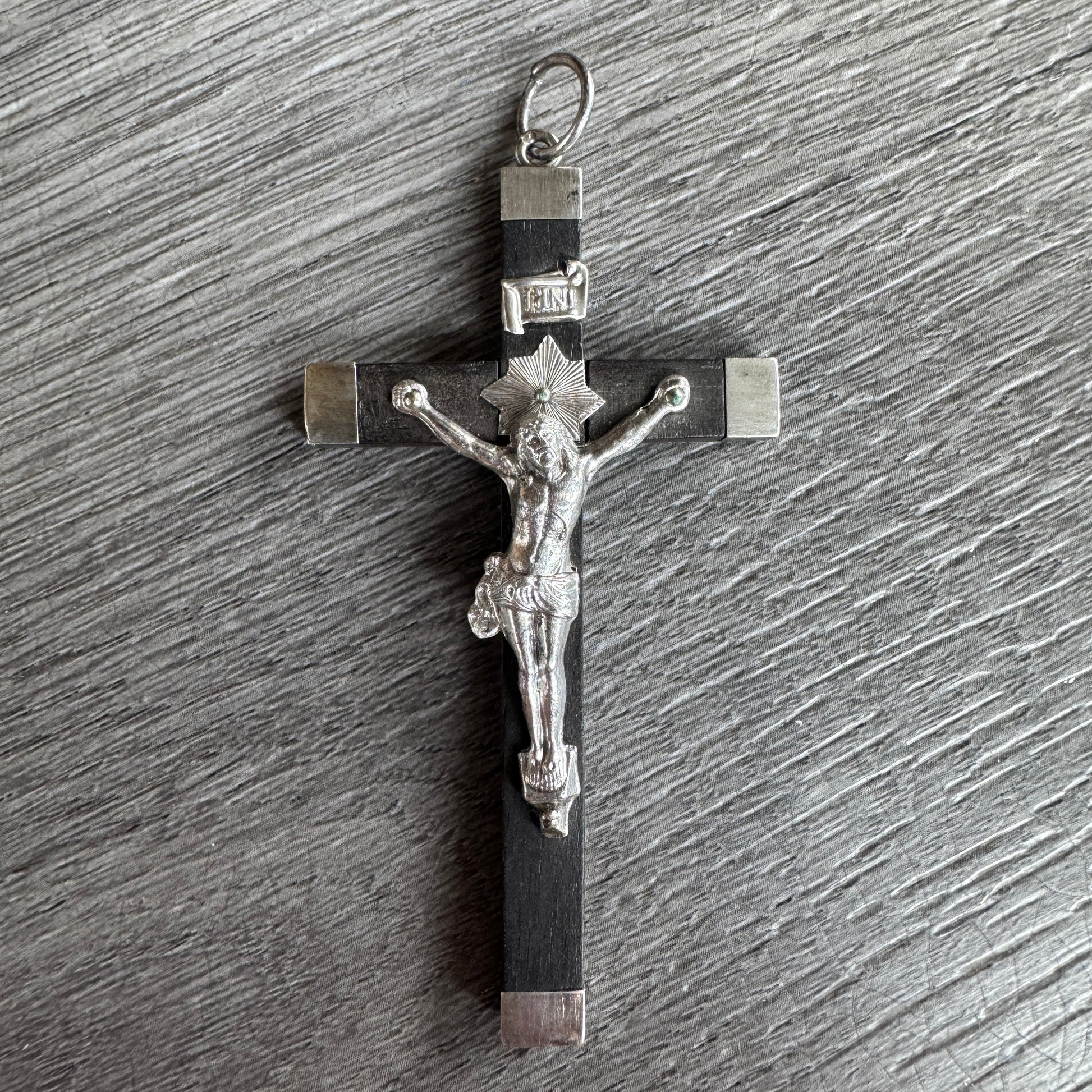 Crucifix religieux datant de la fin du XIXe siècle, combinant une structure en bois noirci avec des éléments en argent. le Christ en crois est finement moulé en relief, expressif et détaillé. Le titulus " INRI" est représenté au sommet de la croix.