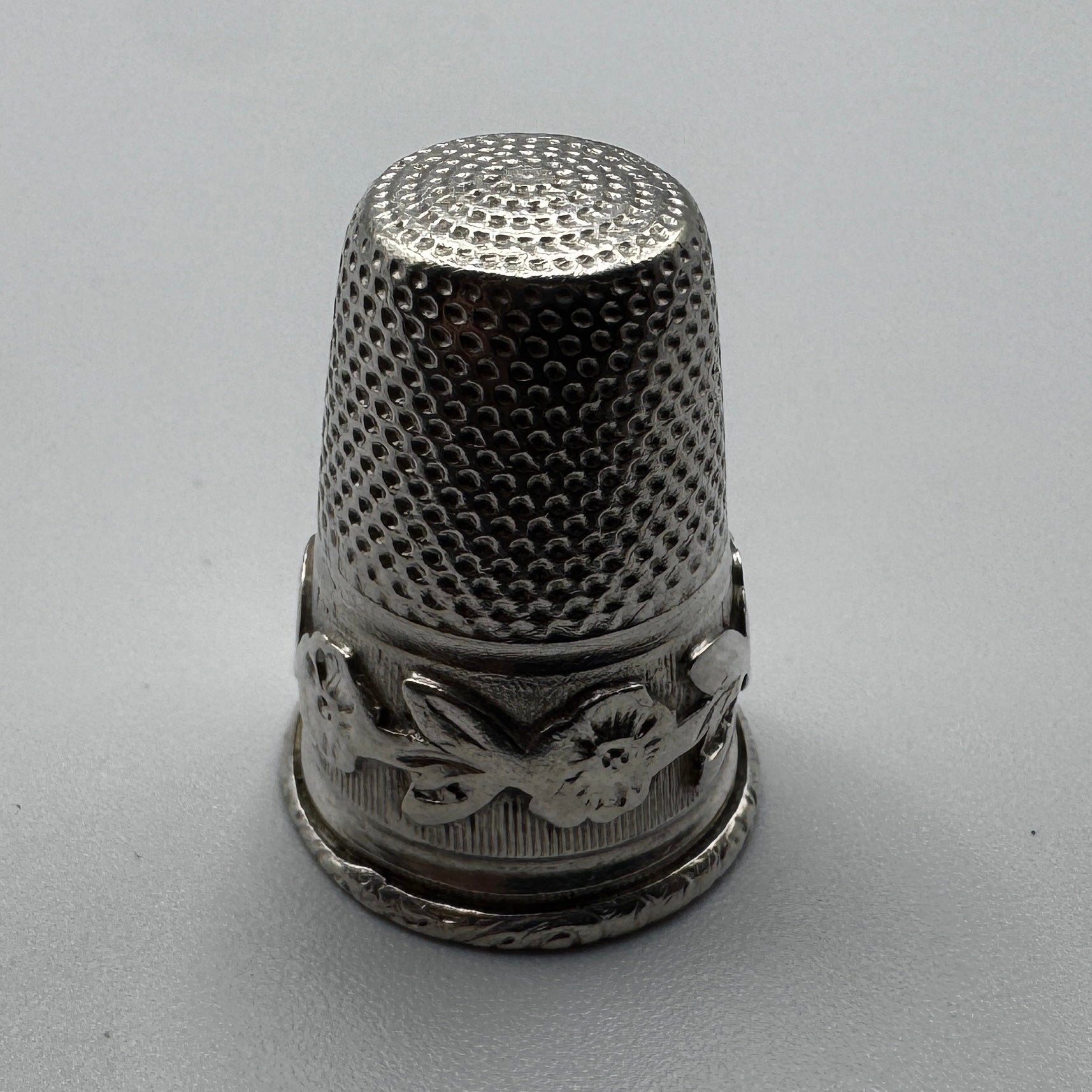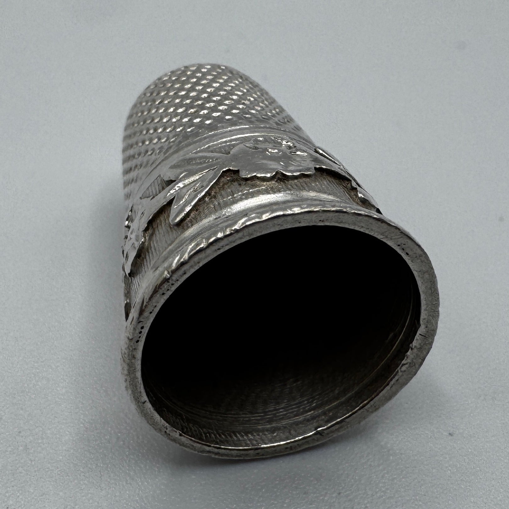 Superbe dé à coudre en argent massif, orné d'un élégant décor gravé à la base : motifs floraux et cartouche en forme de coeur. Sa partie supérieure est finement martelée pour assurer une bonne prise de l'aiguille, tout en offrant une belle brillance à la lumière.