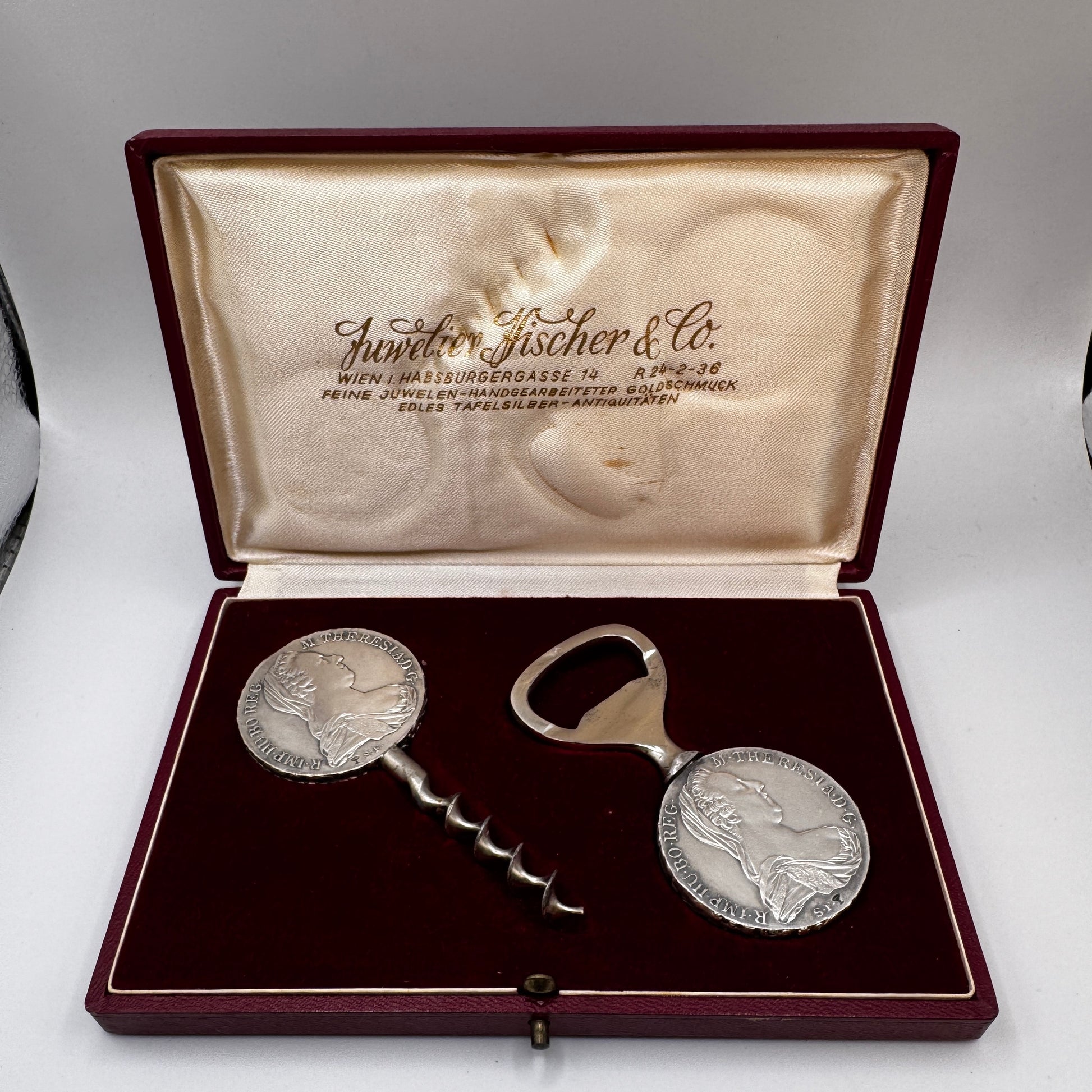 Rare ensemble Décapsuleur et tire bouchon ancien - Monnaies argent Thaler Marie Thérèse