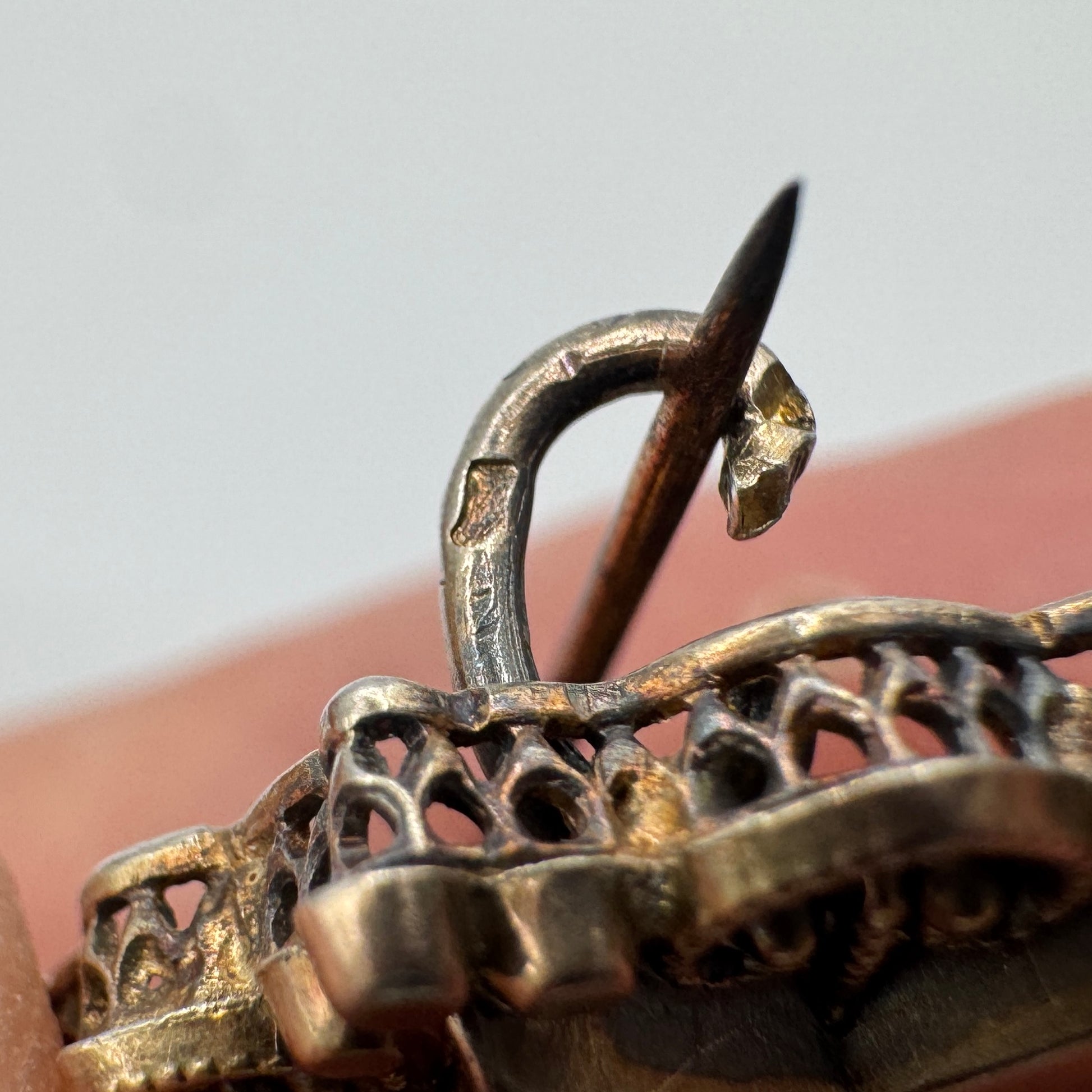 Superbe broche ancienne en forme d'étoile à six branches, finement décorée de motifs ajourés et filigranés.