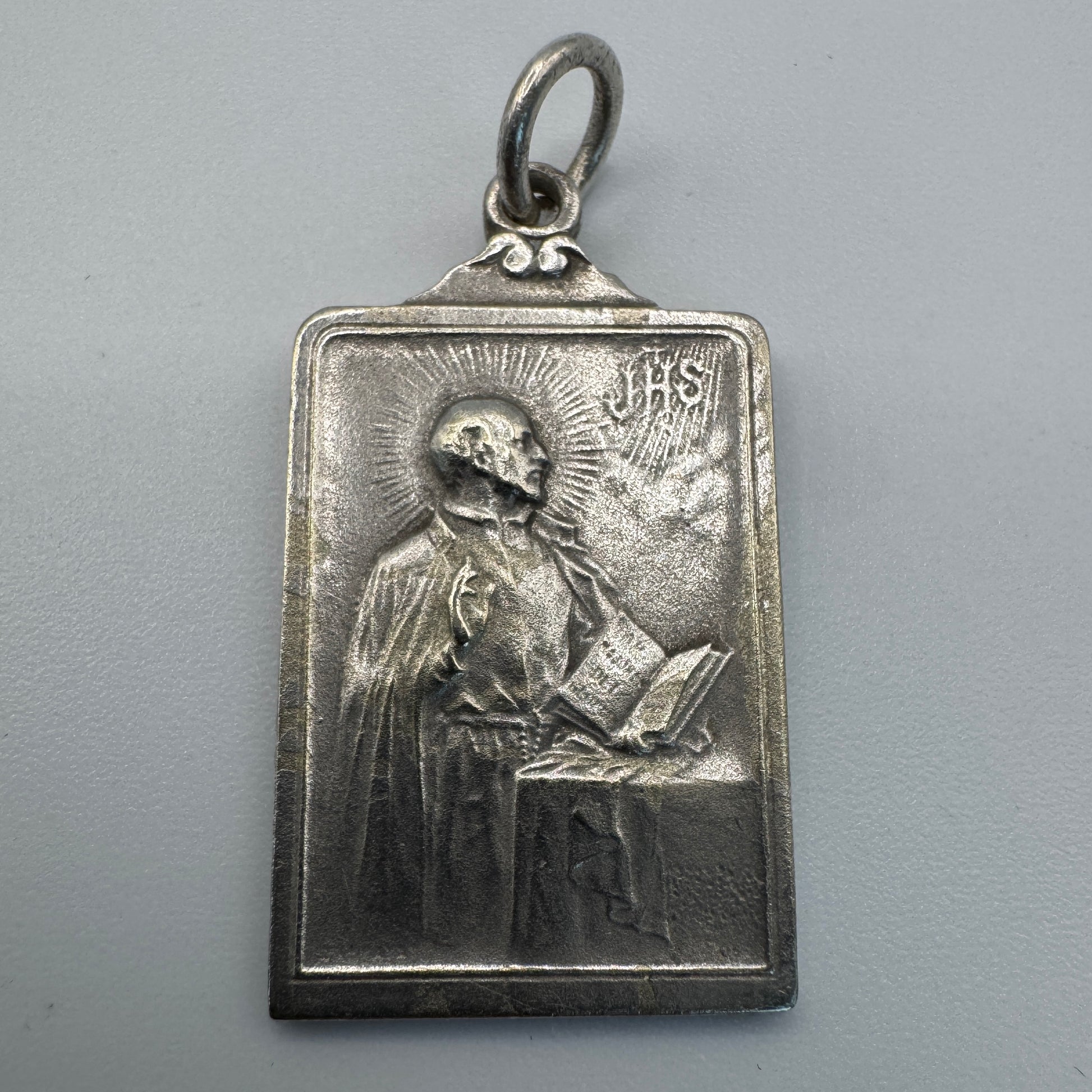 Elégante médaille religieuse ancienne en métal argenté patiné, représentant Saint Ignace de Loyola, fondateur de la Compagnie de jésus. On le voit en prière, penché sur les Evangiles, tandis que les rayons de la lumière divine illuminent son visage.