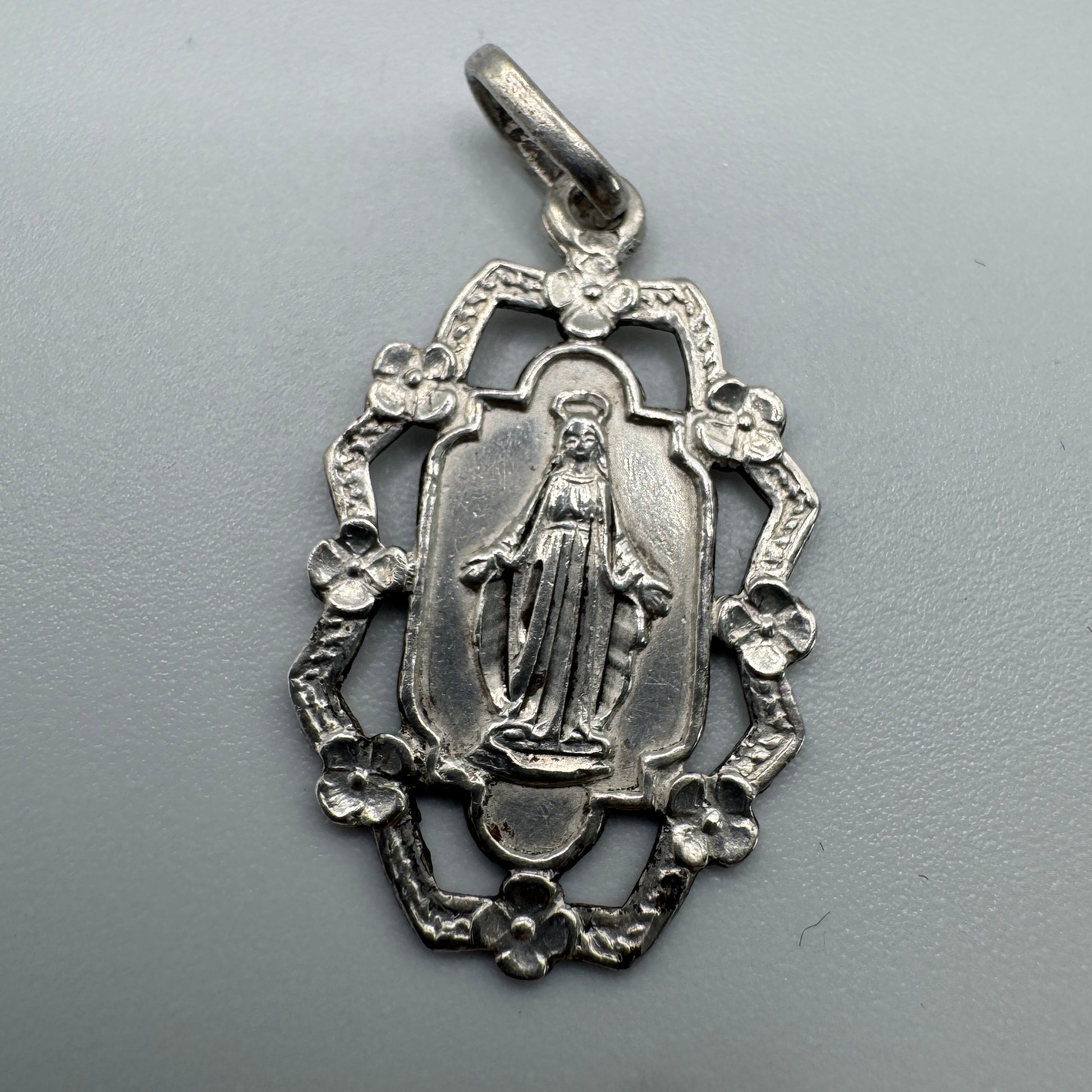 Charmante médaille en argent massif représentant la Vierge Marie en position de bénédiction, entourée d'un délicat décor ajouré de fleurs stylisées.