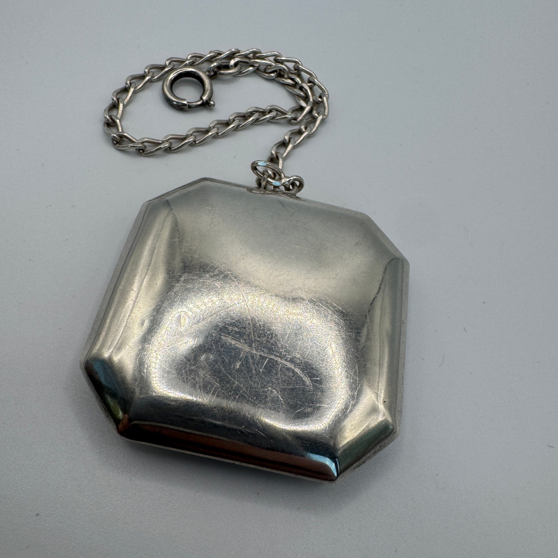 Ce poudrier ancien en argent massif, au design octogonal typique des années 30-40, conjugue élégance et savoir-faire. Son intérieur doré contraste merveilleusement avec l’argent poli de l’extérieur , et le miroir d’origine est toujours présent. Il est suspendu à sa chaînette d’origine, idéale pour le porter à la main ou l’accrocher à une pochette du soir.