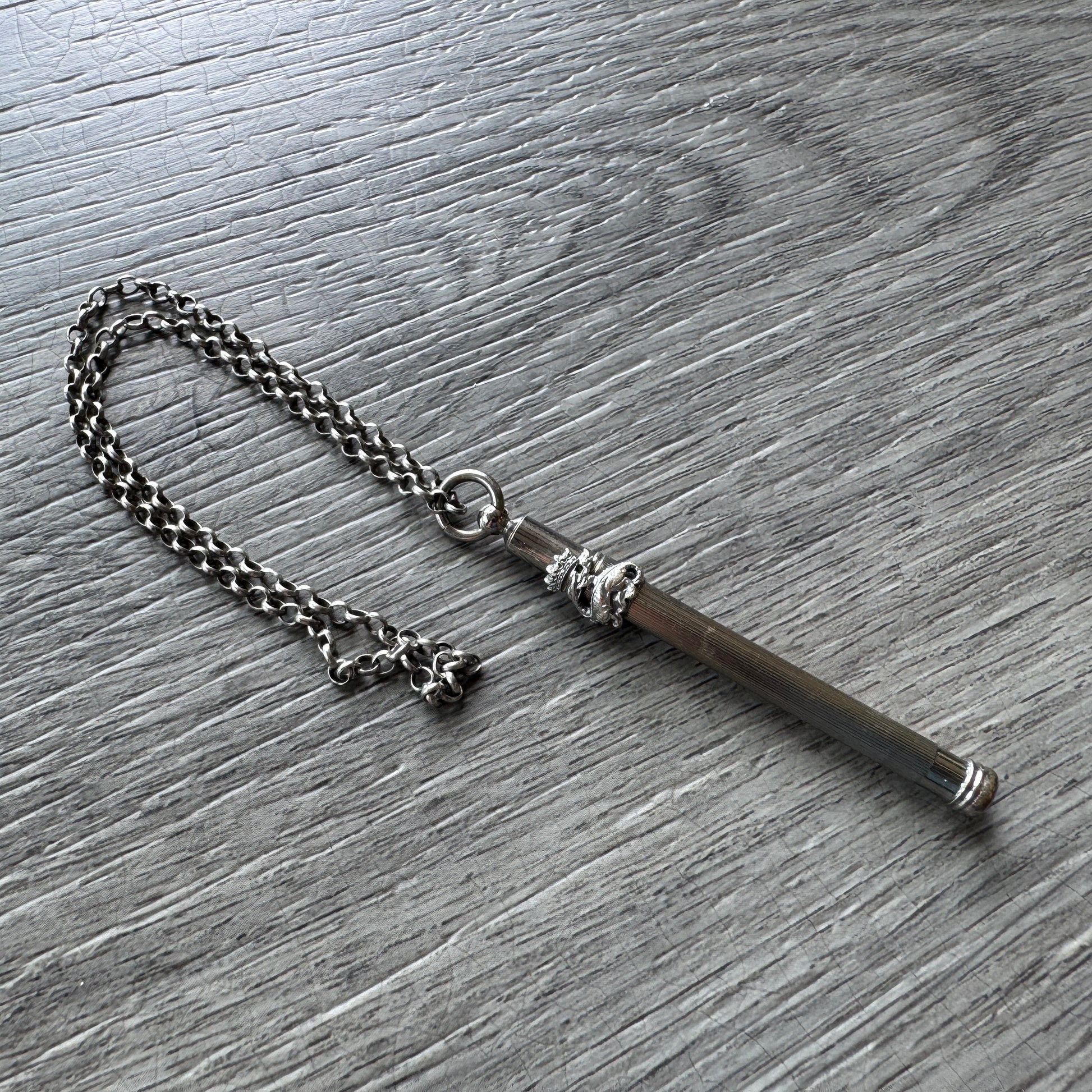 Elégant et original, ce porte-crayon ancien en métal argenté séduit par la finesse de son travail et son ornement rare: une salamandre sculptée en relief enroulée autour du corps du crayon. Symbole de protection et de renaissance et symbole de François Ier, elle apporte à la pièce un cachet unique.